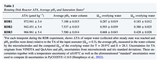 旋轉盤反應器實驗(RDR實驗):模擬海底流體動力學條件,測量文石與方解石混合沉積物的堿度通量變化(表2)。