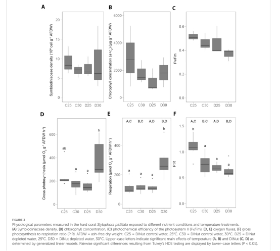研究海水升溫和溶解無機營養(DINut)缺乏對兩種珊瑚(軟珊瑚Heteroxenia fuscescens和石珊瑚Stylophora pistillata)生理和能量代謝的影響。發現:
