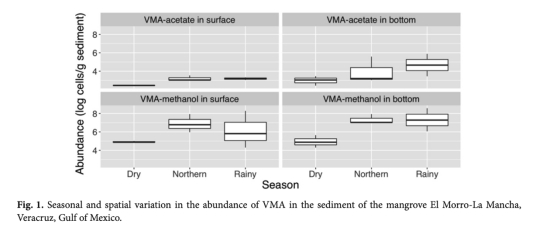 VMA豐度為102–10? MPN/g濕沉積物,以甲醇為底物的VMA豐度(10?–10?)高于乙酸底物(102–10?)。