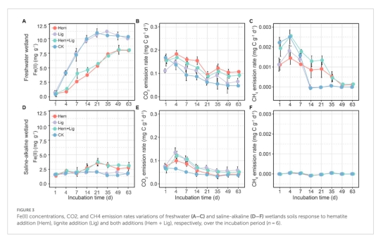 研究通過淡水濕地(富碳鐵)和鹽堿濕地(貧碳鐵)的厭氧培養實驗,探究赤鐵礦(Hem)和褐煤(Lig)添加對土壤有機碳平衡的影響。結果表明:Lig通過促進鐵結合有機碳(Fe-OC)形成導致凈碳積累(淡水濕地:5.9±3.6 mg g?1;鹽堿濕地:8.3±3.2 mg g?1),而Hem通過改變微生物群落結構顯著增加有機碳礦化(尤其在淡水濕地)。結晶態鐵氧化物單獨添加會增強碳礦化,但老碳(富含芳香族和烷基化合物)能促進Fe-OC形成并提高碳持久性。