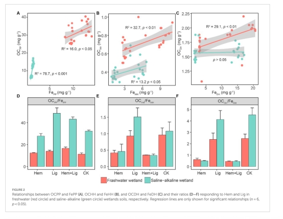 碳保存與礦化平衡:Lig通過形成Fe-OC實現凈碳積累,Hem則因改變微生物群落導致碳損失(圖4)。