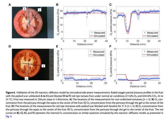 驗證模型預測:測量數據與模型模擬的氧氣梯度高度吻合,證實模型能準確描述果實內部氣體環境。