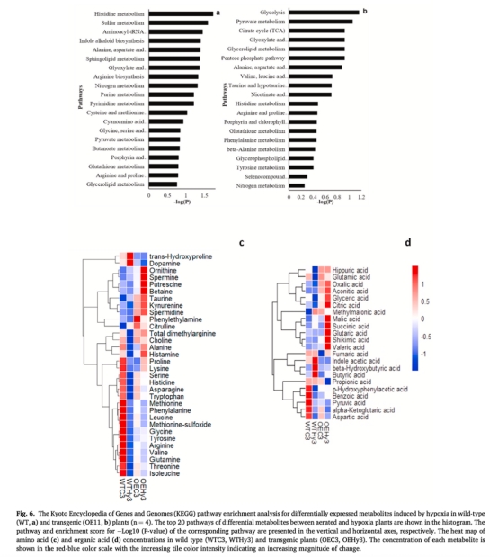 轉基因植株在低氧下增強糖酵解、丙酮酸代謝和TCA循環,而WT轉向氨基酸代謝。