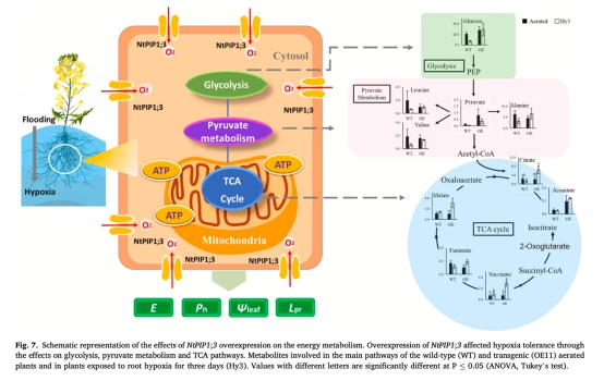 該研究通過過表達煙草的NtPIP1;3基因(一種推測參與氧氣運輸的質膜水通道蛋白)于油菜(甘藍型油菜),探究其在根低氧脅迫下的生理和代謝響應。結果顯示,轉基因植株在淹水脅迫下維持了更高的生物量、光合速率、根水導度、根氧濃度、葉片水勢、根系呼吸速率和ATP水平。代謝分析表明轉基因植株通過調控糖酵解、丙酮酸代謝和三羧酸循環(TCA cycle)增強有氧代謝?;虮磉_分析顯示,轉基因植株的缺氧信號通路基因(如RAP2.12、PCO1/2)表達模式與野生型不同,結合直接測量的根氧濃度數據,證實NtPIP1;3通過促進根系氧供應增強低氧耐受性。