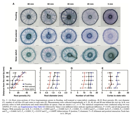 根在淹水條件下形成強(qiáng)外屏障(減少水分和氧氣流失),缺水時(shí)通過(guò)增加通氣組織和小直徑優(yōu)化水分吸收。