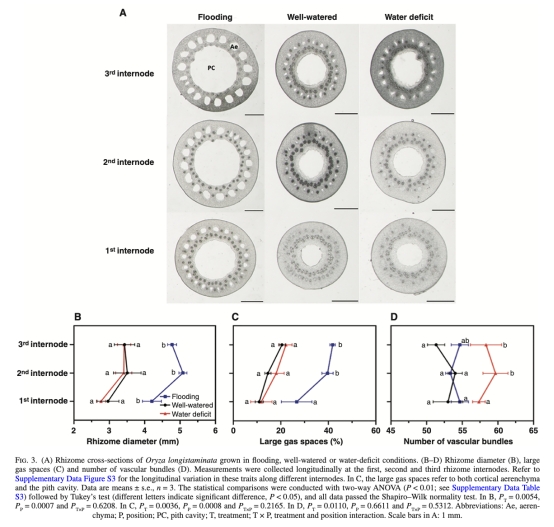 研究長(zhǎng)雄野生稻(Oryza longistaminata)的根和根莖在土壤水分梯度(淹水、正常澆水和缺水)下的解剖與生理響應(yīng),重點(diǎn)關(guān)注根莖的生理整合作用以及根和根莖的結(jié)構(gòu)適應(yīng)性。