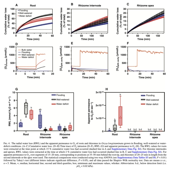 根莖的RWL和氧氣滲透性在所有水分條件下均較低(圖4G-H),顯示其固有屏障功能。
