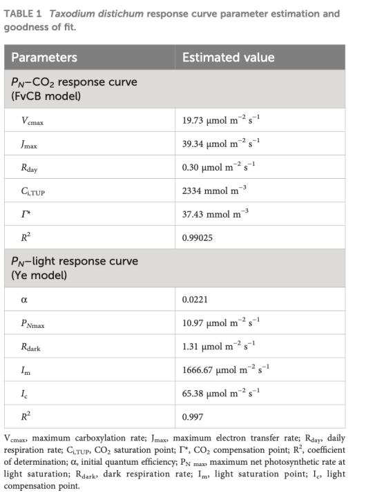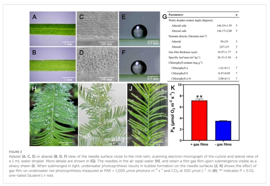 研究探討了耐洪樹種落羽杉(Taxodium distichum)在水下光合作用的響應機制。通過30天的完全淹沒實驗,測量了其水下凈光合速率(PN)、針葉疏水性、氣膜厚度、葉綠素濃度及解剖結構變化,并構建了水下PN對CO2、光照和溫度的響應曲線。研究發現,盡管氣膜厚度和葉綠素濃度隨淹沒時間顯著下降導致PN降低,但即使淹沒30天后仍保留部分光合能力。氣膜的保留(初始厚度35μm)可提升2倍光合速率,但長期淹沒導致氣膜消失,同時針葉柵欄組織降解。