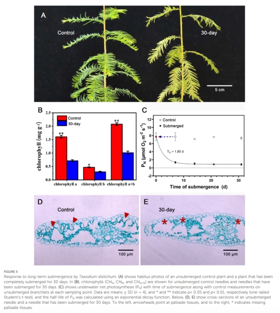 落羽杉通過氣膜保留實現高效水下光合,但長期淹沒導致氣膜消失和葉綠素降解