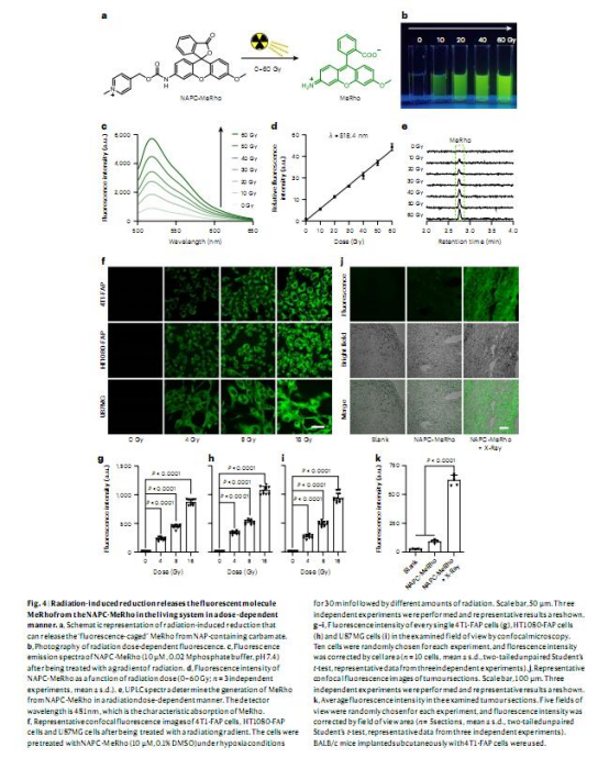 熒光探針驗證:設計NAPC-AMC和NAPC-MeRho探針,驗證其在細胞和腫瘤中的放療激活釋放(圖3-4)。