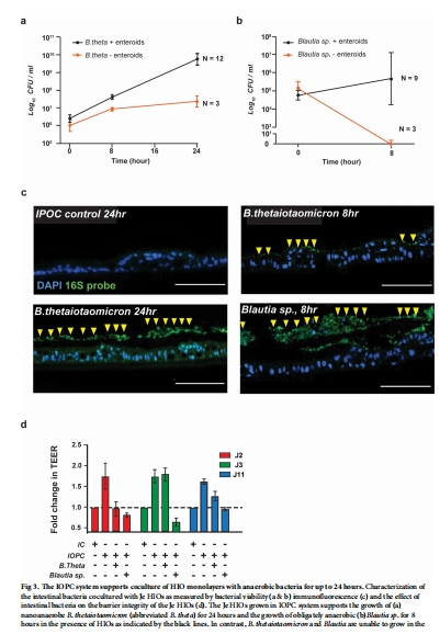 接種厭氧菌(B. thetaiotaomicron 或 Blautia sp.),檢測細菌存活、定位及對HIOs的影響(圖3A-C)。
