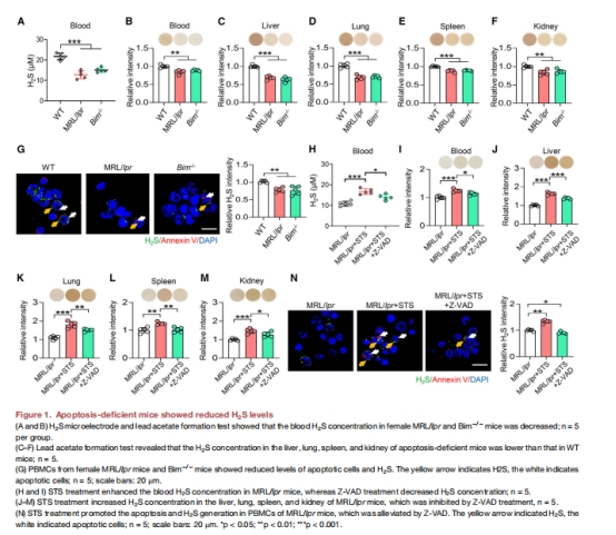 圖1A-B, E-N:凋亡缺陷小鼠(MRL/lpr、Bim?/?)血液/組織中H?S↓;STS誘導凋亡后H?S↑,Z-VAD(凋亡抑制劑)阻斷此效應。
