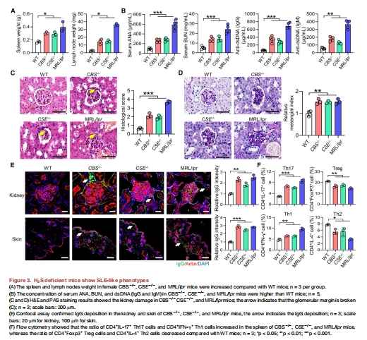 圖3:H?S缺陷小鼠(CBS?/?、CSE?/?)出現SLE表型(脾/淋巴結腫大↑、ANA/dsDNA↑、腎損傷、Th17↑)。