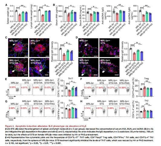 圖4A-D, S3:STS誘導凋亡改善SLE表型,但H?S抑制劑(HA/PAG)阻斷療效。
