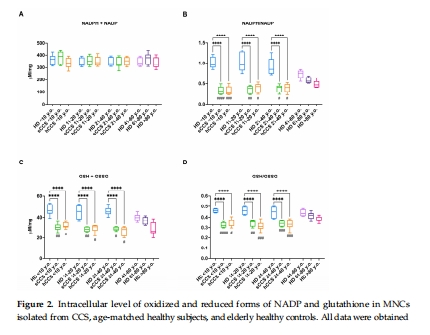 發現:CCS的單核細胞(MNCs)存在抗氧化防御受損(谷胱甘肽通路酶活性降低)和氧化損傷累積(脂質、DNA、蛋白質損傷),類似老年人水平。機制上由Nrf2表達下調驅動。