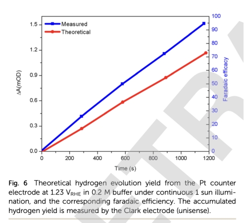 意義:關(guān)鍵定量數(shù)據(jù)!計(jì)算得出在1.23 V RHE、1 sun光照下,H?析出反應(yīng)的法拉第效率約為74%。