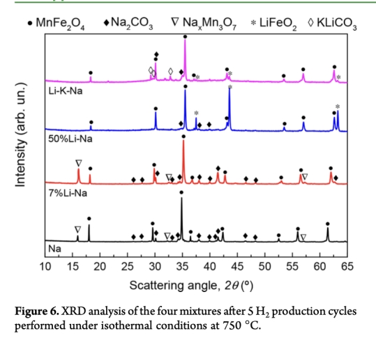 研究通過用不同共晶/共析堿金屬碳酸鹽混合物(如含7%鋰的(Na?.??Li?.??)?CO?)替代鈉錳鐵氧體熱化學(xué)循環(huán)中的Na?CO?。結(jié)果表明,含7%鋰的混合物因部分熔融促進(jìn)離子擴(kuò)散,顯著提升首周期產(chǎn)氫速率,但所有混合物均出現(xiàn)循環(huán)可逆性下降。其中未替代的Na混合物產(chǎn)氫可逆性最高,而高鋰(50%Li-Na)及三元(Li-K-Na)混合物在首周期后幾乎不產(chǎn)氫。可逆性損失歸因于副相形成和燒結(jié)現(xiàn)象,后者在熔融碳酸鹽中更顯著。