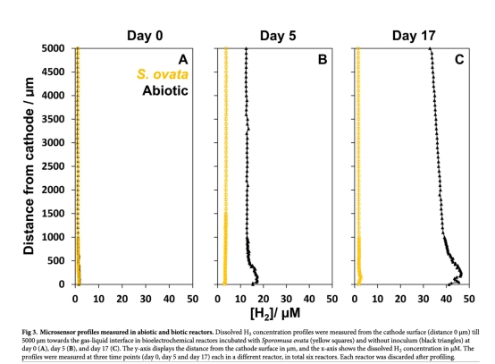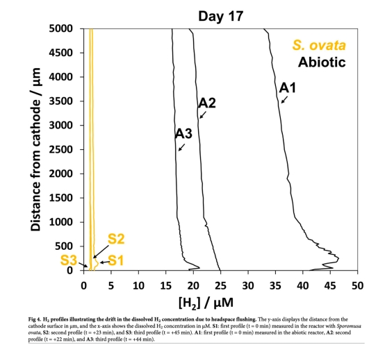 高分辨率動態(tài)監(jiān)測:Unisense微傳感器以25 μm步進(jìn)分辨率捕捉陰極附近H?梯度(圖3),首次直接證實(shí) S. ovata 在陰極表面高效消耗H?(濃度始終<4 μM),而傳統(tǒng)GC僅能檢測頂空氣體,無法反映液相微環(huán)境動態(tài)。