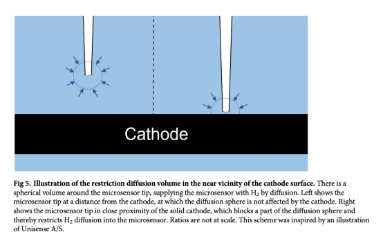 微傳感器在固體陰極表面附近的測量值可能因擴(kuò)散受限而失真(圖5),建議測量點(diǎn)距陰極表面至少兩倍于傳感器尖端直徑(>50 μm)。