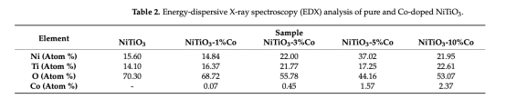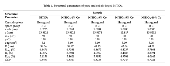 材料合成:采用溶膠-凝膠法制備純NiTiO3及不同鈷摻雜濃度(1%、3%、5%、10%)的樣品。