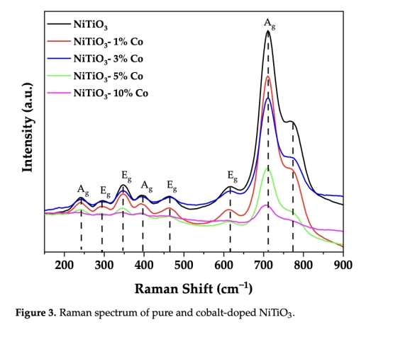 數(shù)據(jù):拉曼峰強(qiáng)度隨鈷摻雜濃度增加而降低(10%Co樣品強(qiáng)度降至純樣的10.8%)。