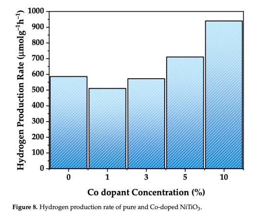 數(shù)據(jù):純NiTiO3為586 μmol·g?1·h?1;10%Co樣品達(dá)940 μmol·g?1·h?1(提升60.4%)。
