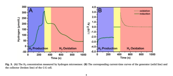 圖2A:發(fā)生器和收集器的電流-時間曲線,顯示H?生成與氧化的動態(tài)過程(60 s達穩(wěn)態(tài))。