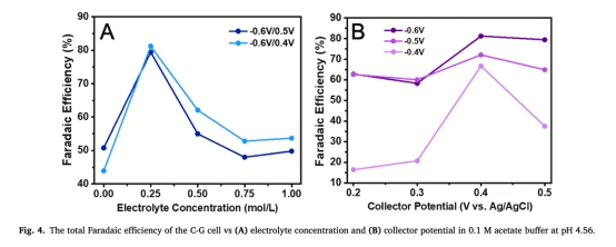 圖4B:收集器電位(0.2~0.5 V)對效率的影響(0.4~0.5 V時效率達70%)。