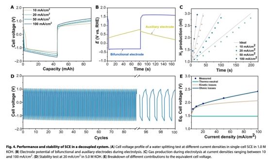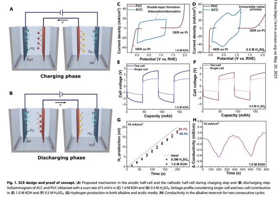 成功開發(fā)無膜解耦電解槽,通過電容機制實現(xiàn)氫氧時空分離,適應酸/堿環(huán)境。