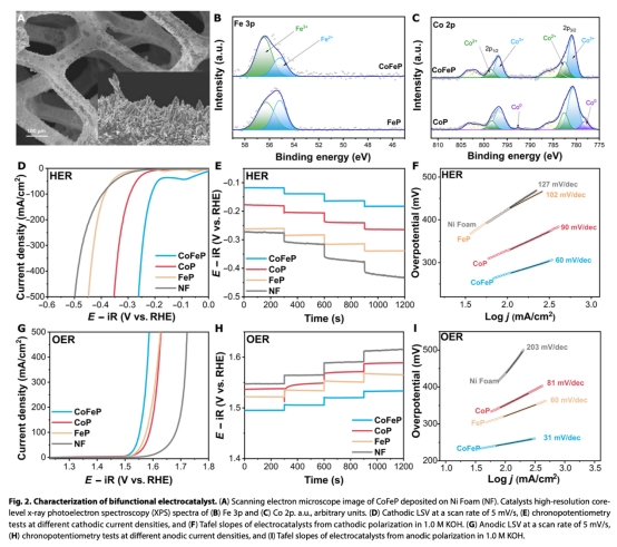 CoFeP雙功能催化劑在100 mA/cm2下法拉第效率達99%,堿性條件穩(wěn)定運行20小時。