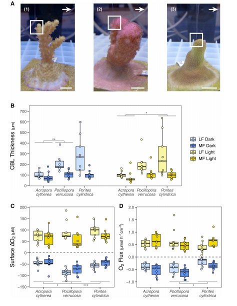 論文通過微傳感器技術測量了三種小型息肉分枝狀珊瑚(Acropora cytherea、Pocillopora verrucosa、Porites cylindrica)的溶解氧濃度邊界層(CBL)特性(厚度、表面氧濃度、氧通量),探究其在光照/黑暗和低/中水流(2 cm/s vs 6 cm/s)條件下的變異性。研究發現: