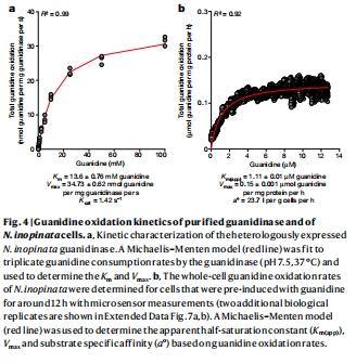 胍降解動力學 圖4a(酶動力學)、圖4b(全細胞) 揭示胍酶高催化效率(Km=13.6 mM),但全細胞胍氧化親和力極高(Km(app)=1.34 μM),說明細胞高效攝取胍(Extended Data Table 1)。