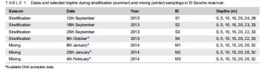 分層期(2013年9–10月)和混合期(2014年1–2月)采集不同深度水樣(表1)。