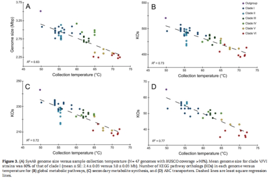 基因組大小 與溫度負相關(R=-0.79),高溫菌株基因組縮小20%,支持基因組精簡假說,但與細胞大小無關(推翻傳統模型)。 Fig. 3A, Supp Table 3