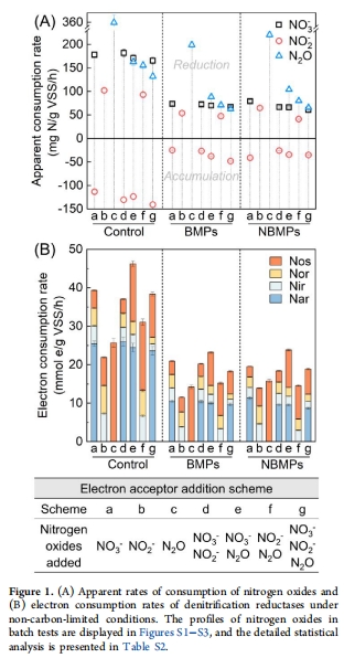 氮氧化物消耗速率 圖1A, 圖S1-S3 量化微塑料對反硝化速率的抑制程度(BMPs > NBMPs)。
