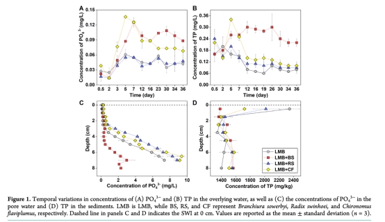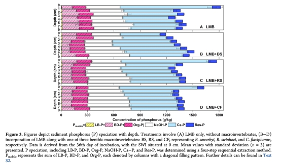 LMB效能:大型無脊椎動物不改變LMB整體固磷量(各組TP沉積量無顯著差異),但通過垂直重分布影響局部磷循環。