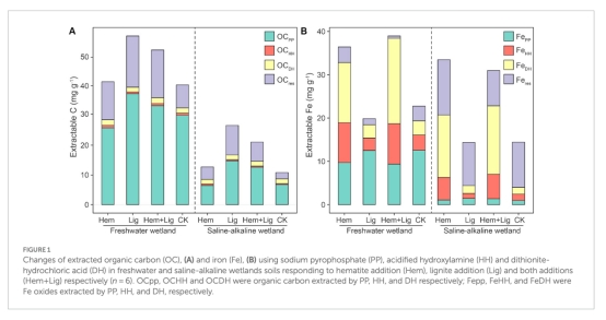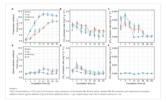意義:反映微生物鐵還原活性和OC礦化強度。Hem在淡水濕地中導致最高CO?排放(圖3B),證實其促進OC礦化。