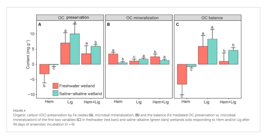 量化鐵氧化物介導的OC保存與礦化的凈效應,明確結晶鐵氧化物(Hem)和老舊碳(Lig)對濕地土壤碳匯恢復的潛在影響。
