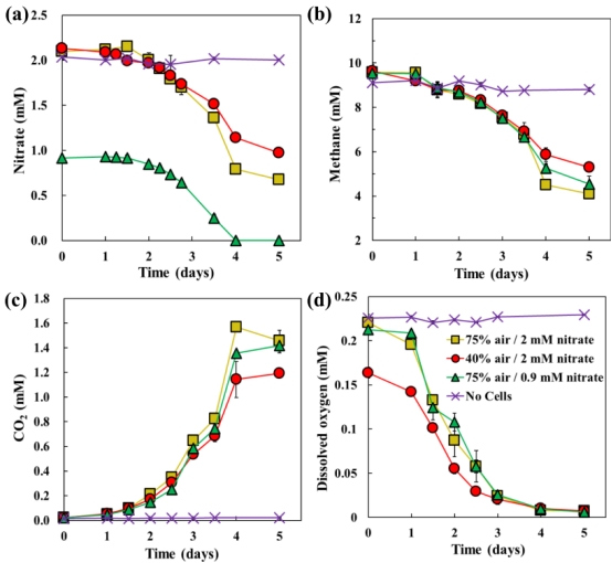 數據:2 mM NO??下硝酸鹽還原速率0.35 mM/day,CH?氧化速率1.1 mM/day;低氧(40%空氣)時速率分別降至0.24 mM/day和0.87 mM/day。