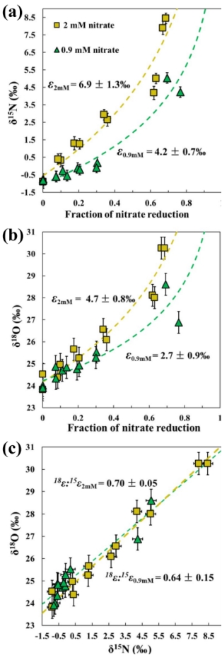盡管氧氣濃度改變代謝速率,但 同位素分餾比值(1?ε:1?ε)未受影響(圖4c),表明分餾主要發生于酶反應步驟(Nas催化),而非質量轉移過程。