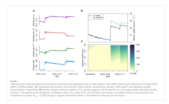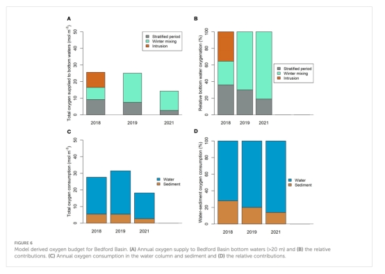 研究通過(guò)耦合水柱-沉積物模型,結(jié)合長(zhǎng)期監(jiān)測(cè)數(shù)據(jù)(溫鹽、溶解氧、葉綠素?zé)晒猓┖统练e物微剖面測(cè)量,量化了加拿大貝德福德盆地(Bedford Basin)底層水氧氣的來(lái)源與消耗。關(guān)鍵發(fā)現(xiàn):