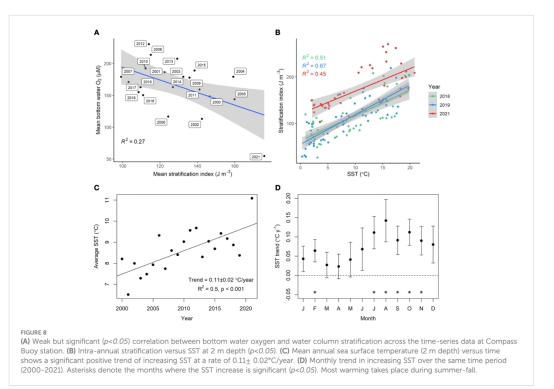 海表溫度上升(0.11℃/年)增強(qiáng)層化,削弱冬季混合(圖8),導(dǎo)致2021年供氧減少50%。