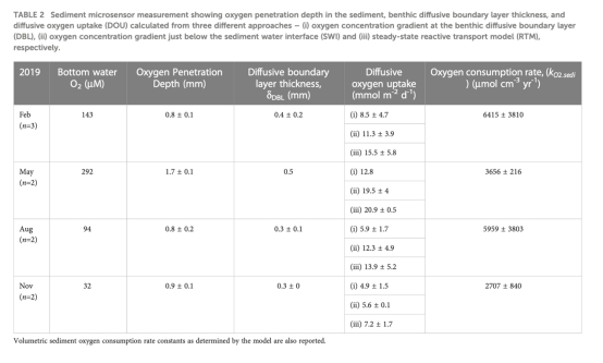 沉積物測(cè)量:季節(jié)性微剖面(氧滲透深度、擴(kuò)散通量DOU)(圖5,表2)。