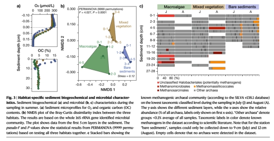 生境機制差異:大型藻類CH?源于巖石縫隙沉積物和附生微囊產甲烷菌;混合植被和裸沉積物CH?由沉積物古菌主導。