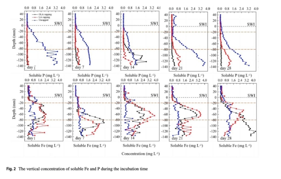 磷釋放抑制:OLA使孔隙水SRP濃度降低82%(對照組的0.18 mg/L→0.05 mg/L),DGT有效態磷在0-70mm深度顯著降低(圖2, 圖3)。