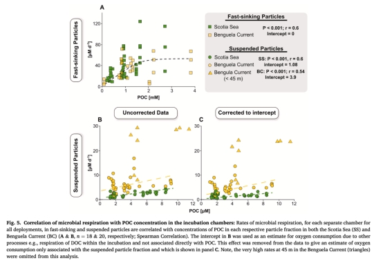 通過線性回歸分析耗氧與POC濃度關系,量化懸浮顆粒呼吸中45%(斯科舍海)和13%(本格拉寒流)由溶解有機碳(DOC)驅動(圖5B)。