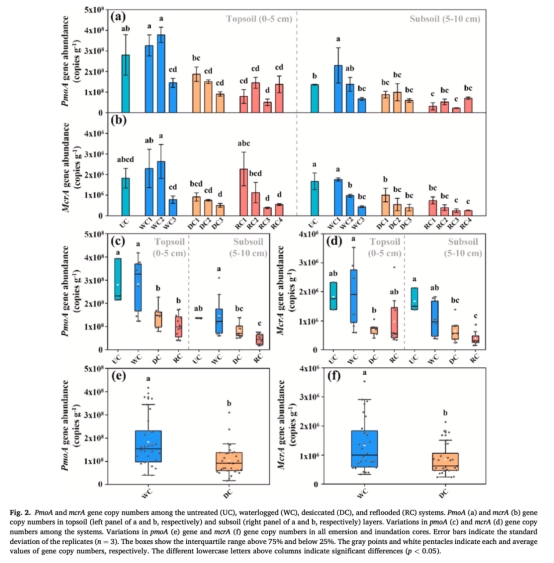 pmoA基因豐度:水淹組(WC)最高(6.7×10?–3.8×10? copies g?1),干燥組(DC)最低(5.9×10?–1.9×10? copies g?1)。