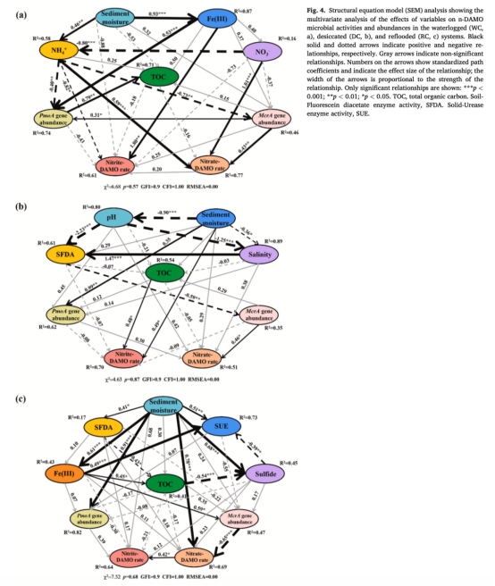 SEM模型顯示:水淹期NO??直接促進(jìn)硝酸鹽-DAMO活性(路徑系數(shù)0.68),干燥期鹽度通過降低mcrA豐度間接抑制活性(路徑系數(shù)-0.54*)。