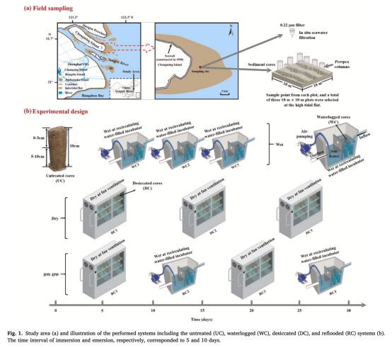 研究通過模擬潮汐周期(水淹、干燥、再淹)實(shí)驗(yàn),探究長江口潮間帶沉積物中n-DAMO(亞硝酸鹽/硝酸鹽依賴型厭氧甲烷氧化)微生物群落、豐度及活性的響應(yīng)機(jī)制。主要發(fā)現(xiàn):