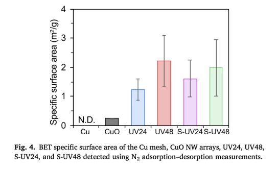 光電性質(zhì):UV-vis光譜測光吸收,BET法測比表面積(圖4),LSV/CV測光電流(圖5A),計時電流法測穩(wěn)定性(圖5B)。